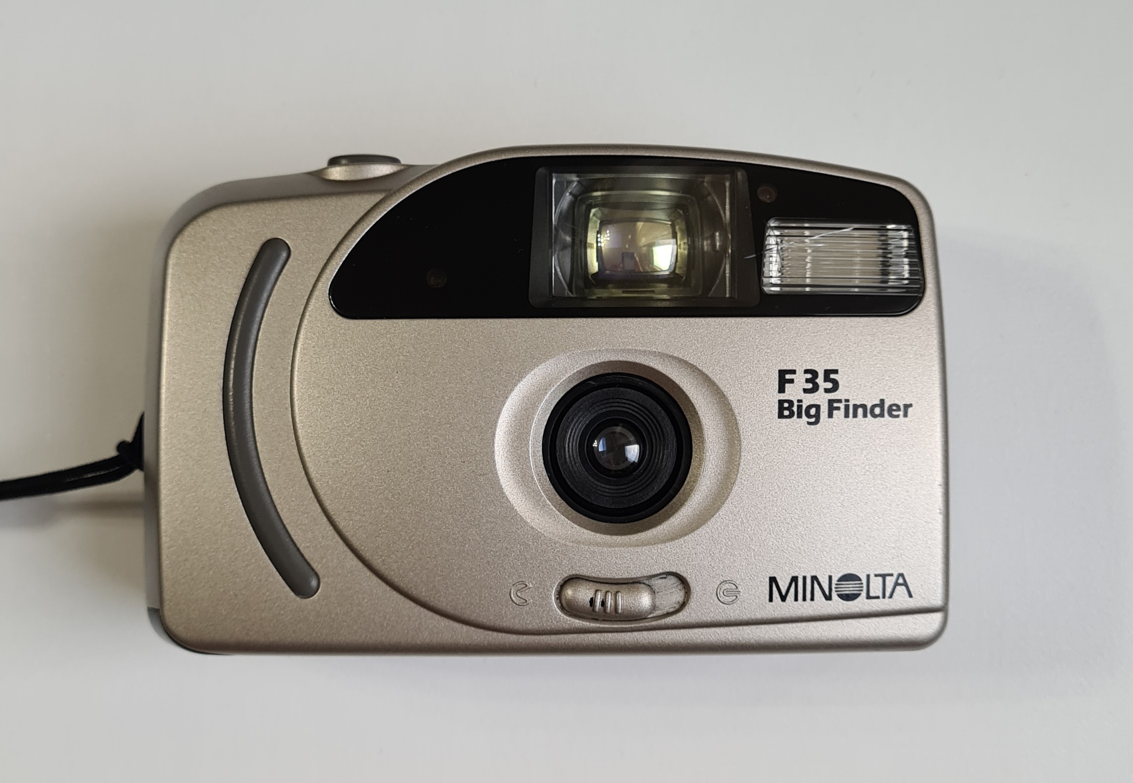 Potpuno ispravan analogni fotoaparat Minolta F35 Big Finder, odlično očuvan, ima jednu sitnu pukotinu u regiji blica, ali ne smeta pri funkciji istog, nije testiran na film.