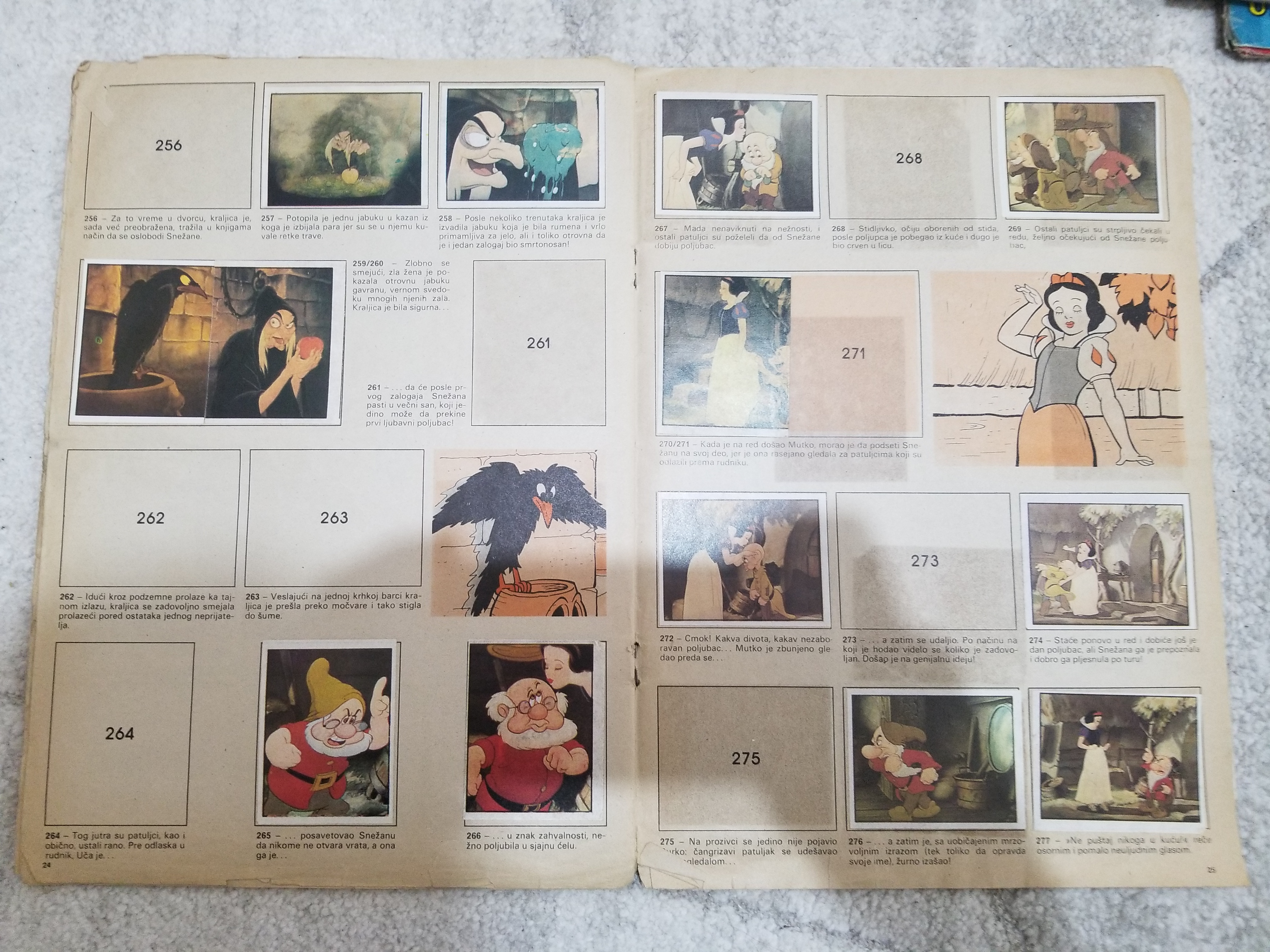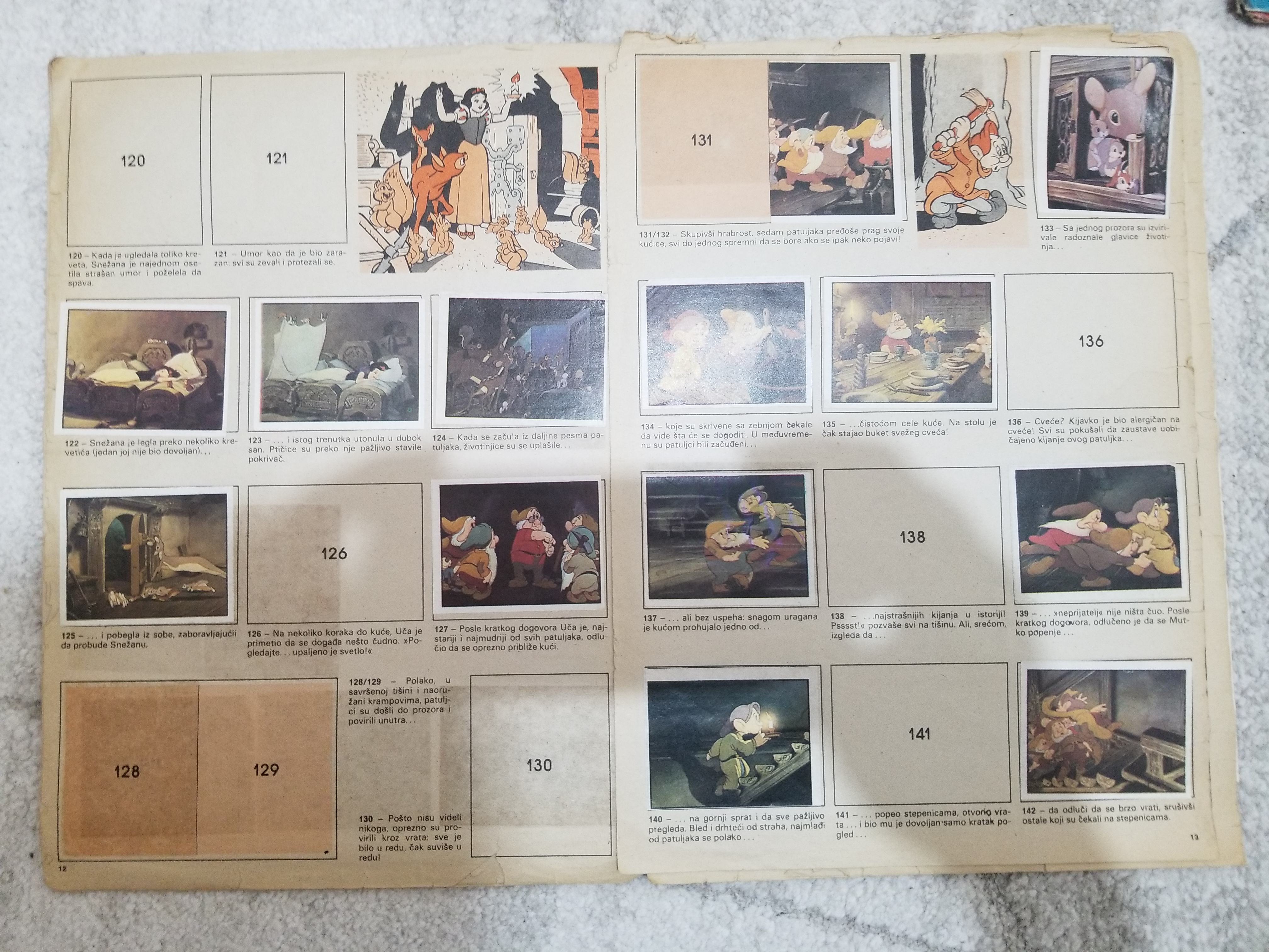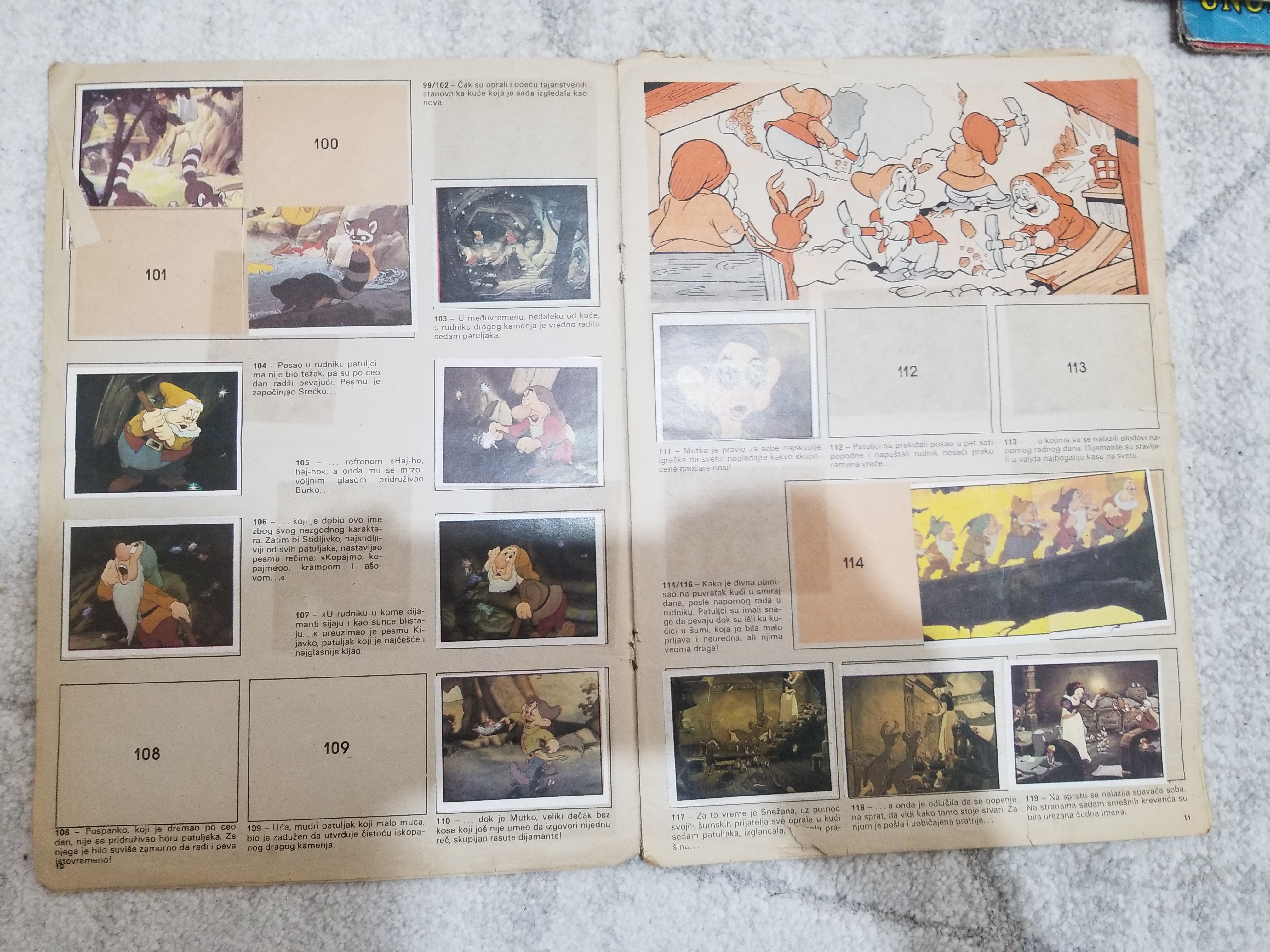 Snezana i 7 patuljaka - staro panini izdanje, zalepljeno 154 od 359 popunjeno, album u losem stanju, za vadjenje slicica. Fale stranice 1,2 15-18. 350 dinara