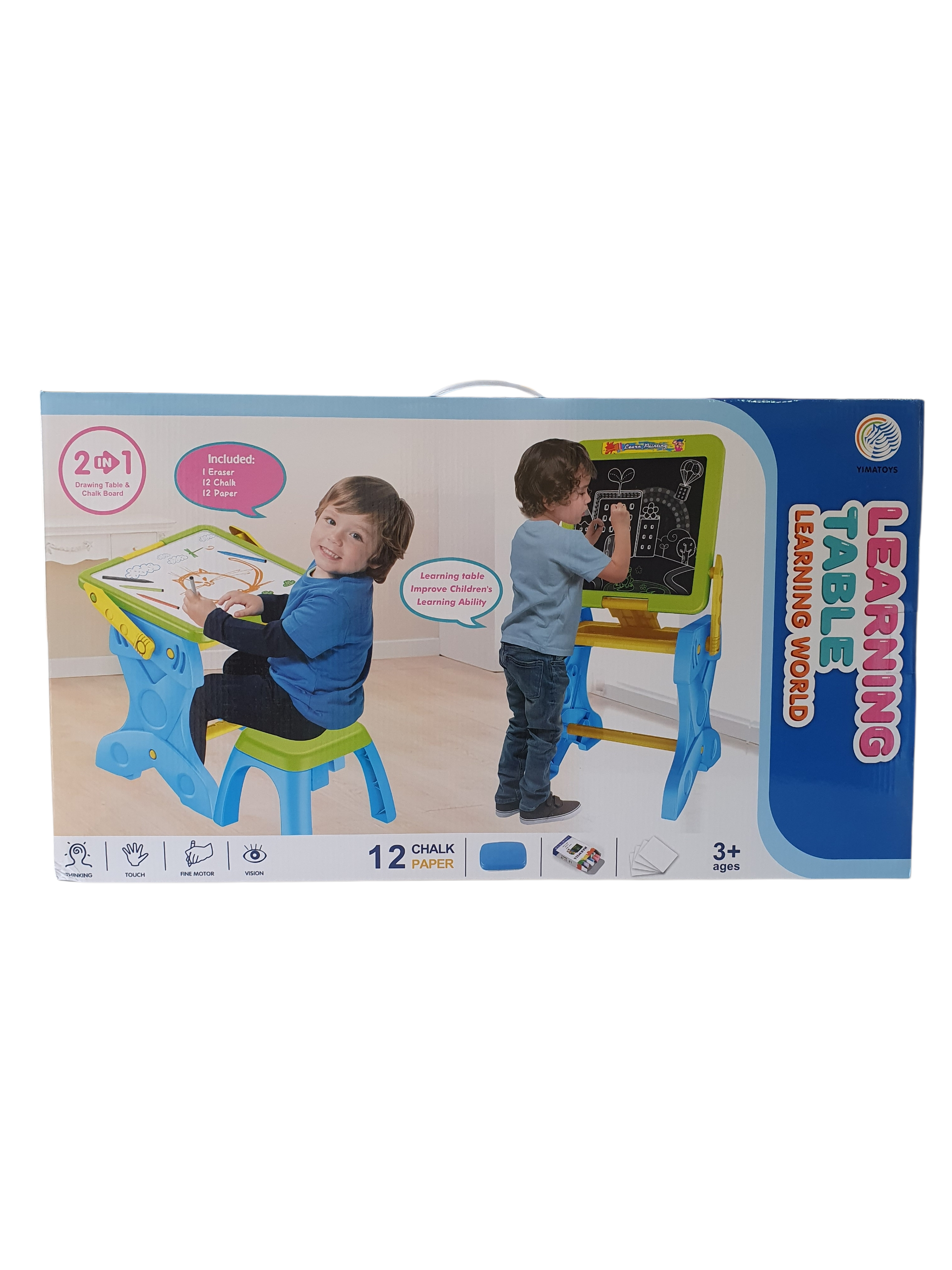 Sto za pisanje i igru se lako pretvara u tablu za crtanje jer se ploča stola podiže. Ispod table je odeljak za pribor. U setu dolazi i stolica kao i papir i krede. Dimenzije table 75 x40x37cm