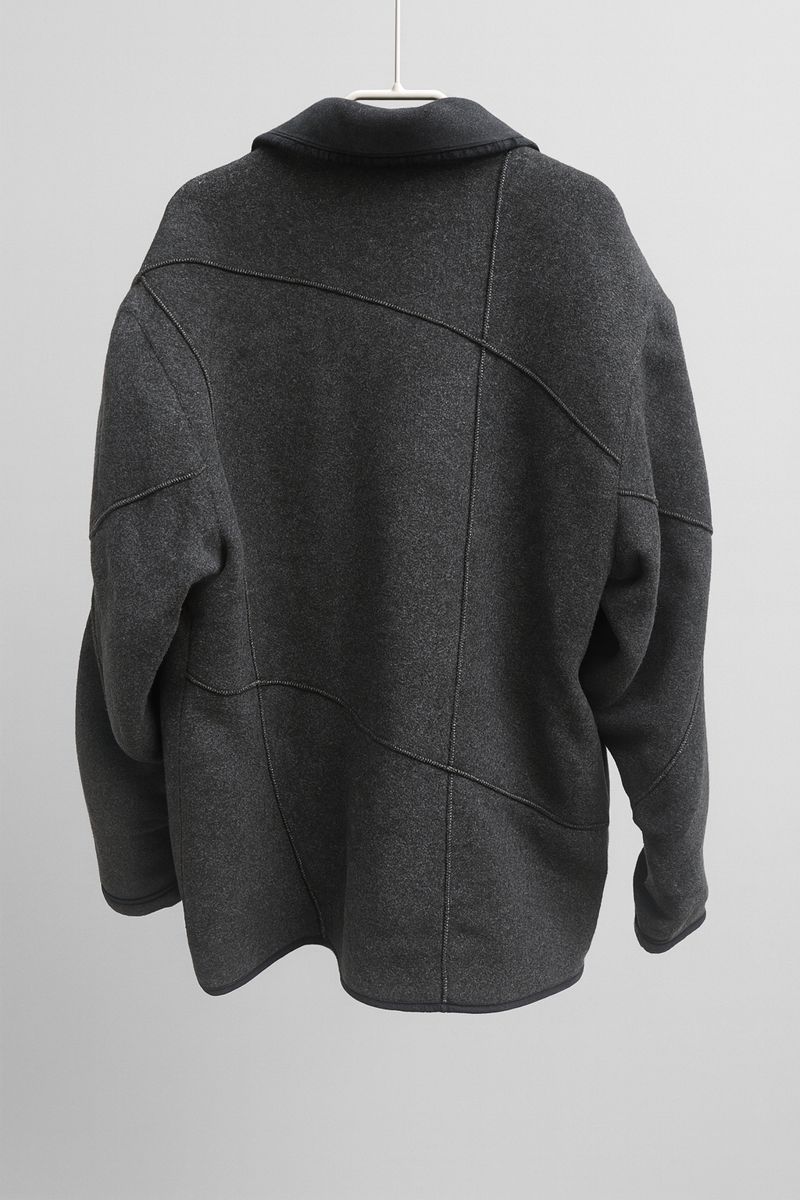 Jakna ima zanimljive dekorativne štepove koji joj daju moderan i drugačiji izgled, uz zadržanu eleganciju.