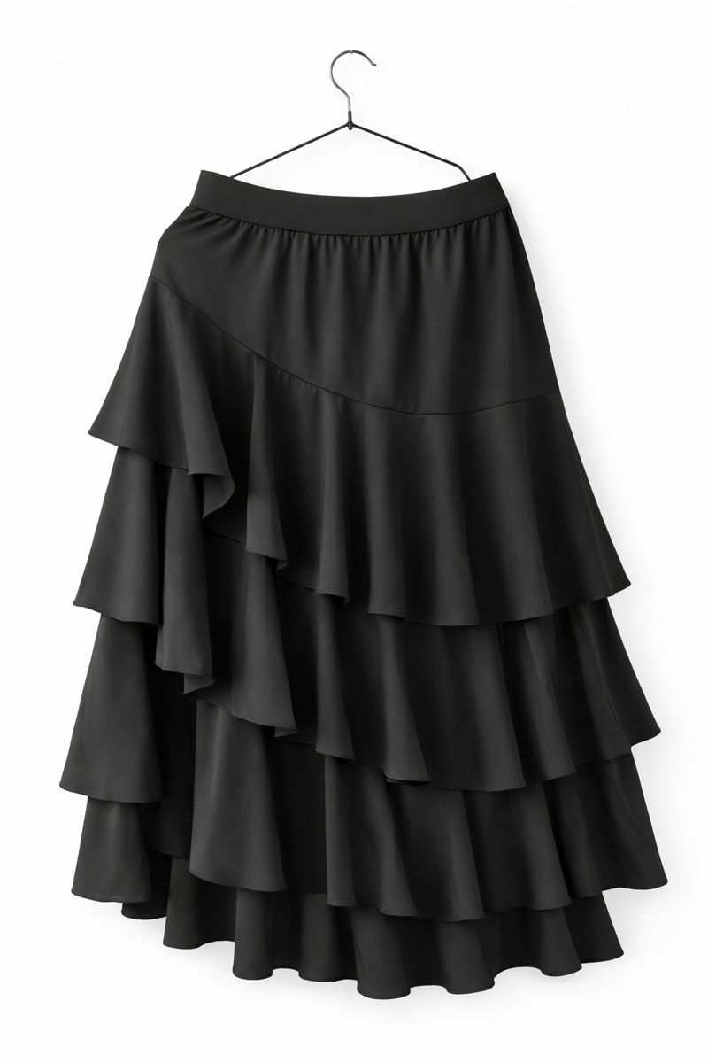 Elegantna crna suknja od viskoze, lagana i prijatna za nošenje. Kroj sa više slojeva (volana) daje lep pad i pokret. Struk je rastegljiv, lako se prilagođava i udobna je za ceo dan. Može i za svakodnevne i za elegantnije kombinacije.